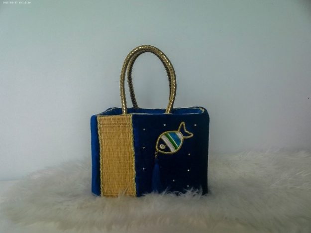 Un sac unique qui mélange le bleu profond et la matière naturelle tressée. Il est fait à la main et décoré d’un motif poisson avec de petits bijoux. Pratique et très élégant, il vous apporte la touche de luxe du fait main pour tous les jours